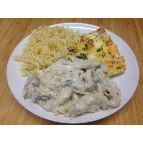 Emincé de poulet, champignons à la crème et riz aux légumes